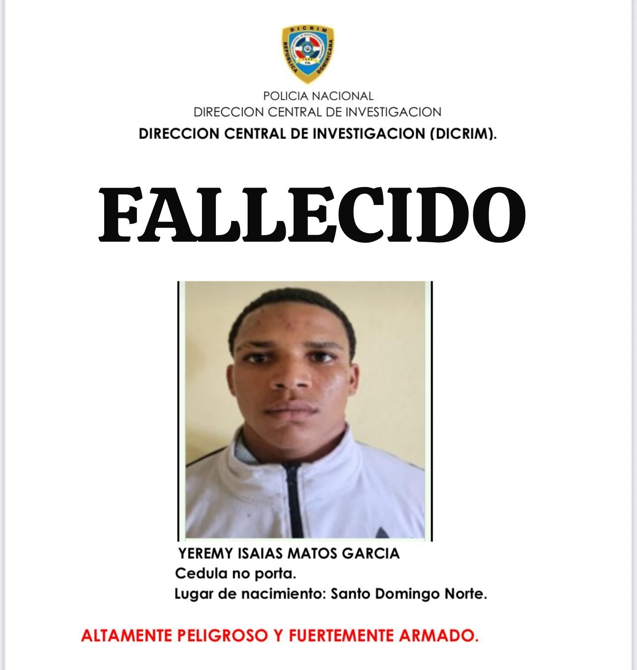 Se trata de Yeremy Isaías Matos García, de 21 años, quien, al momento de su fuga, cumplía una condena de seis años de prisión por violación a los artículos 379, 382 y 383 del Código Penal Dominicano, relativos al robo agravado.